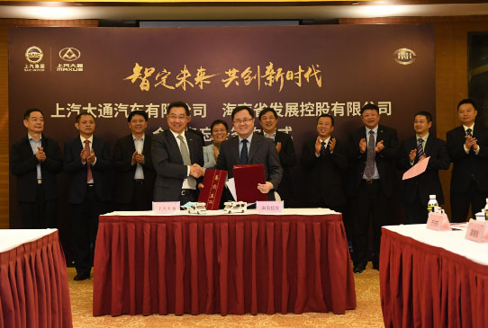 上汽大通與海南控股合作備忘錄簽約儀式在博鰲亞洲論壇大酒店舉行。上汽集團副總裁藍青松,上汽大通總經理徐秋華,上汽大通黨委書記傅鼎