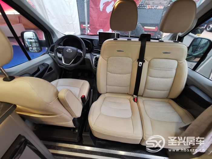 短軸房車內部往往都是采用緊湊型布局,這款也不例外。駕駛艙1+2能坐下3人,后部會客區雙人座椅全車荷載5人。前后排座椅中間設計有餐桌,內側設計為多個功能組合柜,配置也不少,有電磁爐、洗菜盆、65L車載冰箱、上部還有一臺24V直流變頻空調。