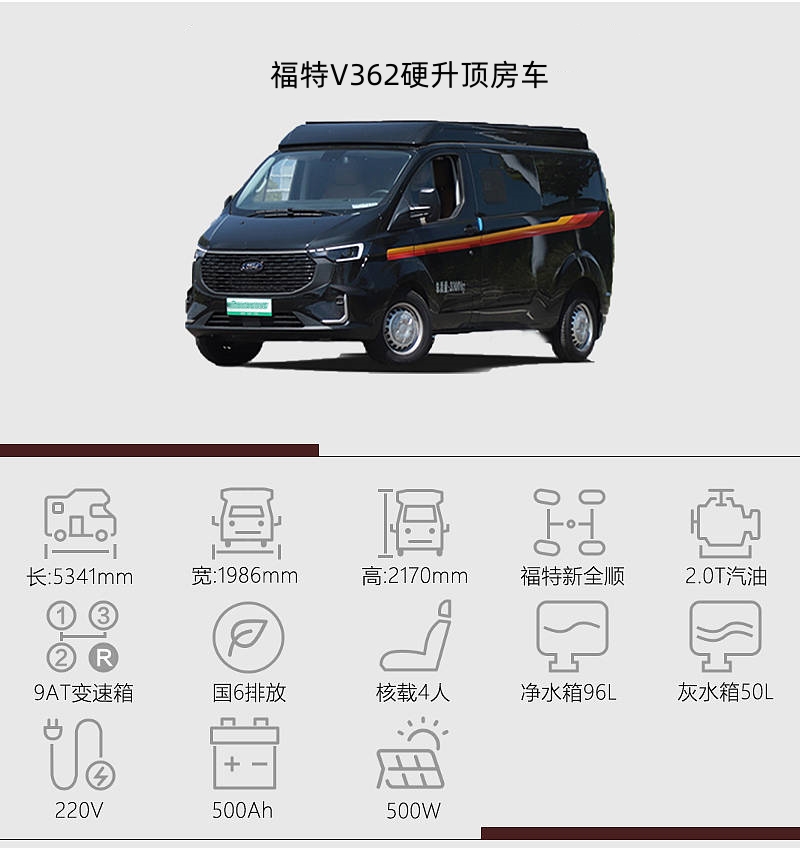福特V362硬升頂商旅房車是一款集成商務、旅居、代步于一體的產品,福生利用福特新全順底盤的優勢,融入更多自己的元素與想法進行改裝升級。新車的亮點體現在通過性上,2米出頭的車高,城市大部分限高路段都可以通過,升頂完成后也不失旅居體驗。另外,配置層面,兩張航空座椅長途舒適性更好,無論是商務接待還是帶著家人自駕游都很適用。