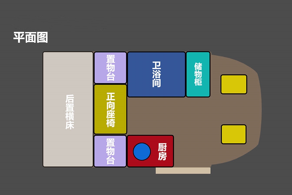 新車生活區由衛浴間、廚房區、正向雙人座椅、尾置橫床組成,車內布局比較緊湊,更適合2人左右的旅居體驗。