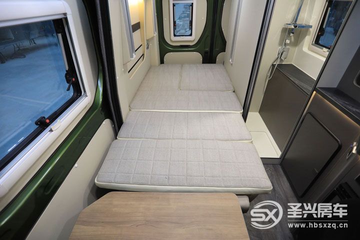 獵裝版車型配有電動升降床,上鋪尺寸為:1900×900(mm),下鋪可通過折疊后排座椅形成一個尺寸為:1950×1000(mm)的常態床。