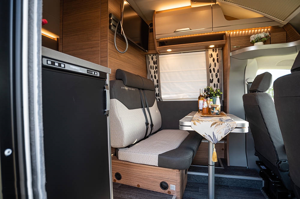這臺(tái)大眾T6 MQ使用前上門布局,打開車廂門中間就是會(huì)客區(qū),采用單排卡座+餐桌的形式,主副駕駛座椅均可旋轉(zhuǎn),當(dāng)主副駕座椅向后旋轉(zhuǎn)后便可與后排形成對(duì)坐布局,餐桌還帶有延長(zhǎng)拓展桌板滿足旋轉(zhuǎn)后4人同時(shí)使用,日常會(huì)客、就餐、辦公以及娛樂活動(dòng)都不在話下。