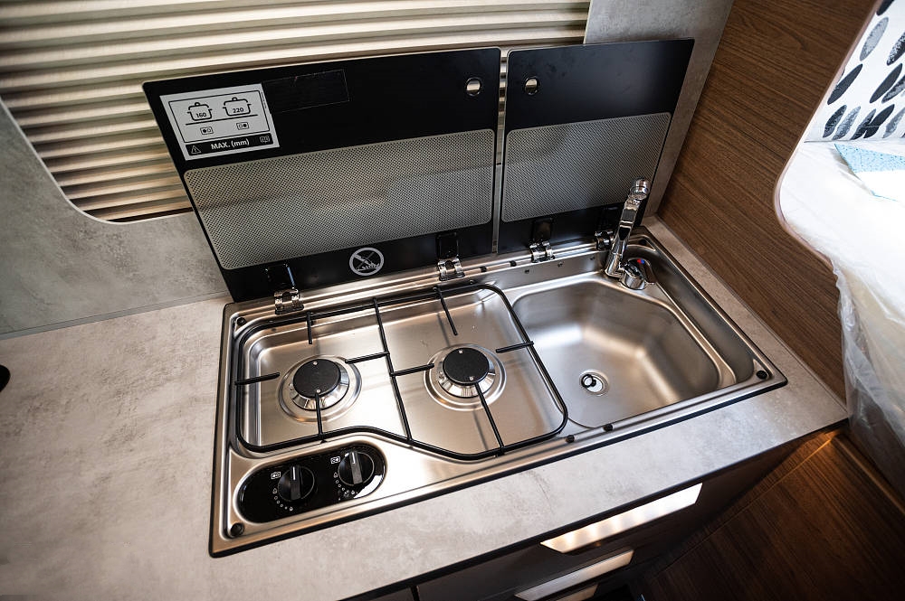 “麻雀雖小五臟俱全”用這句話來(lái)形容T6 MQ的廚房區(qū)簡(jiǎn)直太貼切了,體積小巧的操作臺(tái)內(nèi)竟然內(nèi)嵌了帶蓋板的雙眼燃?xì)庠詈拖词殖兀筮厖^(qū)域可作為日常操作的空間。