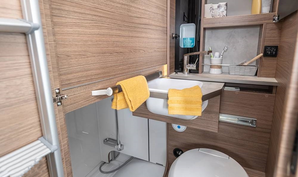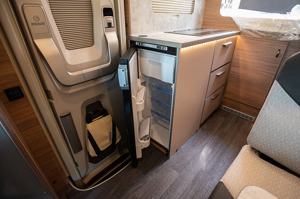 臺(tái)面下方內(nèi)嵌一臺(tái)90L房車專用冰箱,內(nèi)含7.5L冷凍室并帶有夜間靜音模式,最大程度保證夜晚靜謐的睡眠環(huán)境。