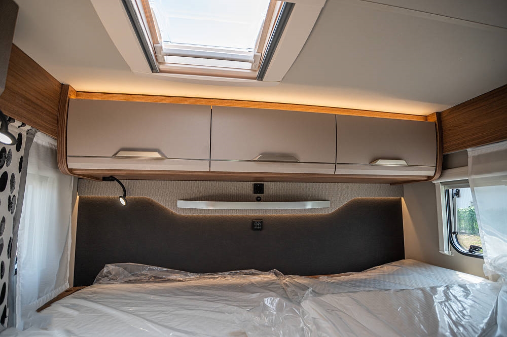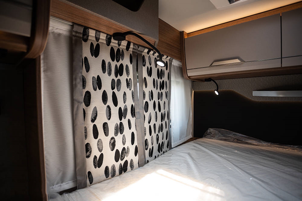 后置橫床可供兩名成年人休息,尺寸為2000x1350(mm),靠近車尾進(jìn)行了整體軟包處理,床頭配備獨(dú)立燈帶和閱讀射燈,方便夜晚閱讀聊天,具備角度調(diào)節(jié)功能。
