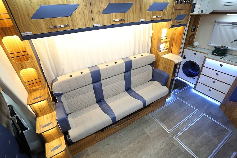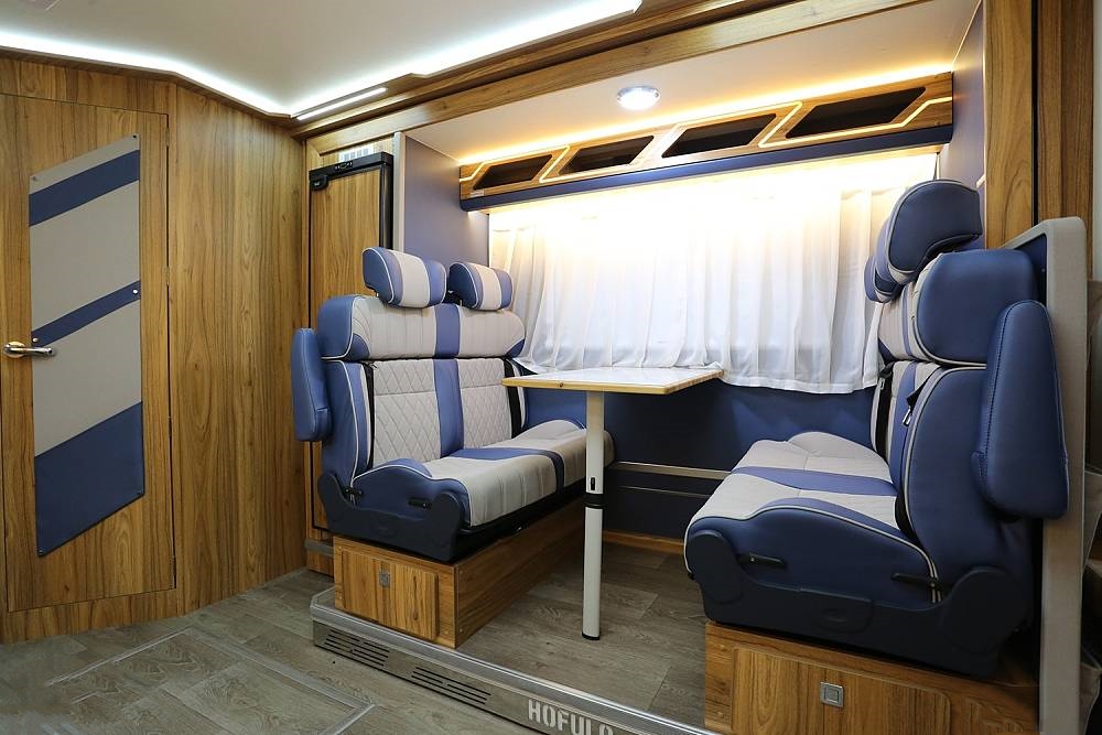 內飾方面,勇者房車內部采用藍白內飾風格作為全新的設計,有點海洋系的感覺。整體感覺來說,白藍配色觀感清新,加上原木色的板材飾面,更加原生態。吸頂式造型頂燈與四周吊柜造型相呼應,頂燈與氛圍燈帶相襯托的整體燈光效果,使得夜晚的車內空間充滿了居家溫馨感。布局方面,整車以額頭床+中置長條沙發+4人會客區+車尾廚房+衛生間布局,對于這款布局我們比較常見,但對于勇者這款房車來說,是第一次嘗試,側向沙發和4人會客區座椅全部來自于乘用車的座椅標準,安全性上得到了保證。