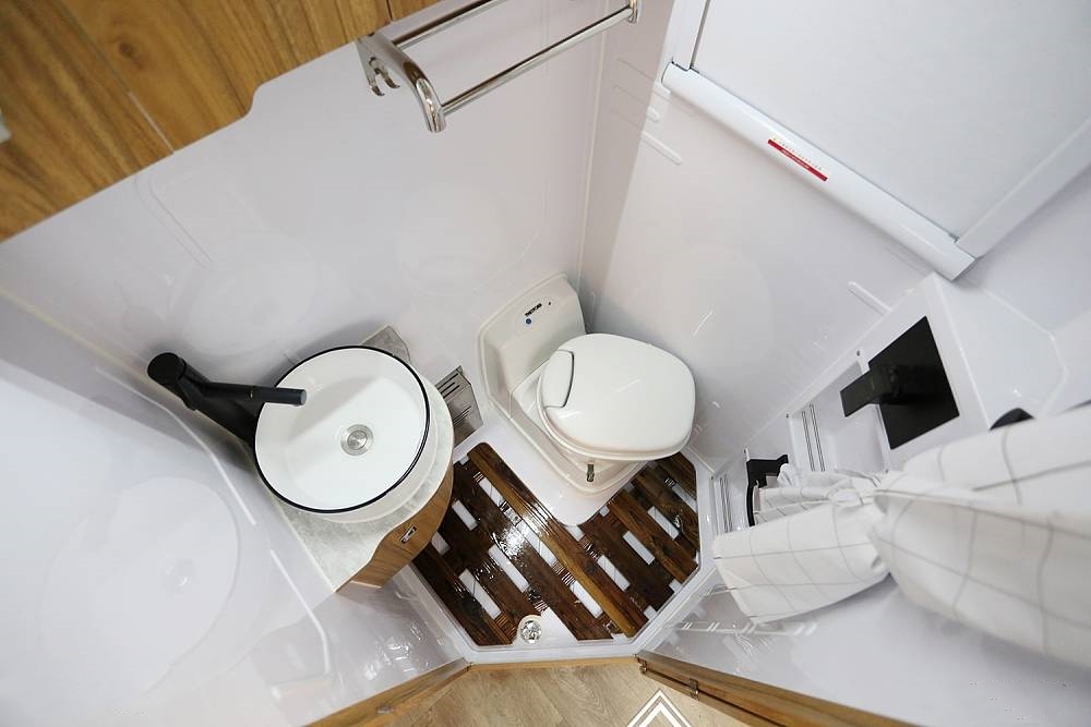 衛生間簡潔明了,搭配一款圓形陶瓷洗臉池、頂部雙向換氣扇、對開門洗漱品儲物格、毛巾架以及化妝鏡和獨立的淋浴花灑。水路系統方面,勇者房車配備的是230升凈水箱、80升熱水箱、95升灰水箱。
