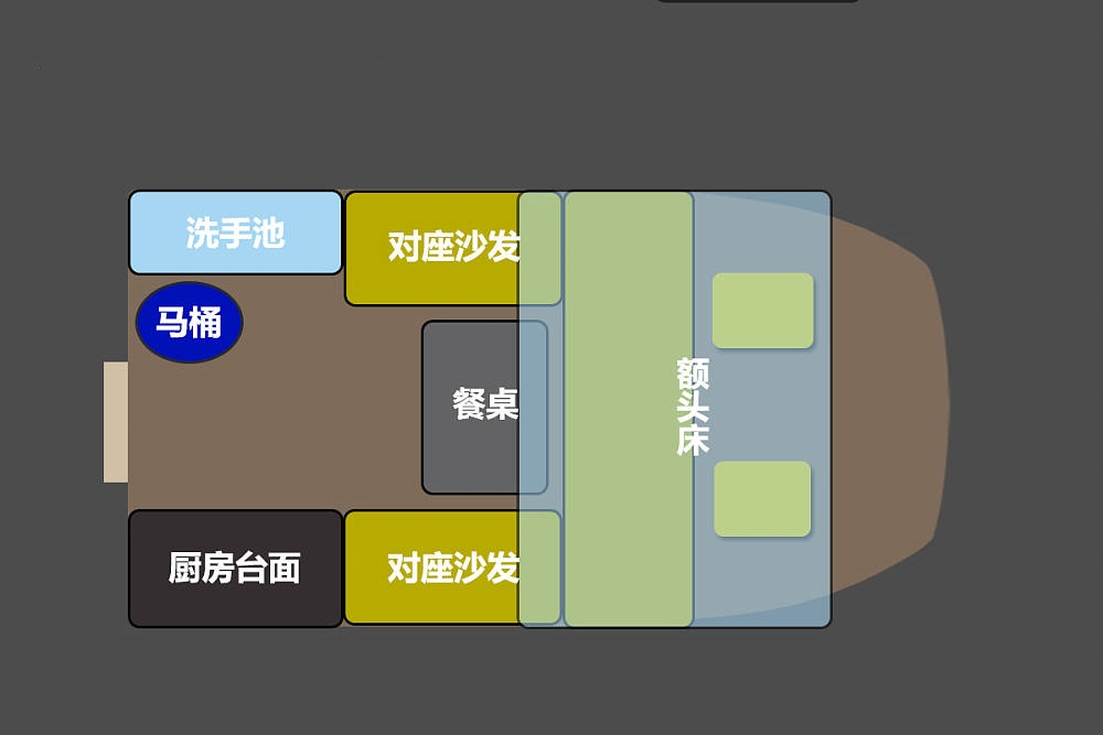 生活區內部由額頭床、對向卡座、廚衛區組成,內部只能在駐車休息時使用,行駛中不能載客。內部整體風格清新宜家,針對整體布局來說更適合2人左右的旅居需求。
