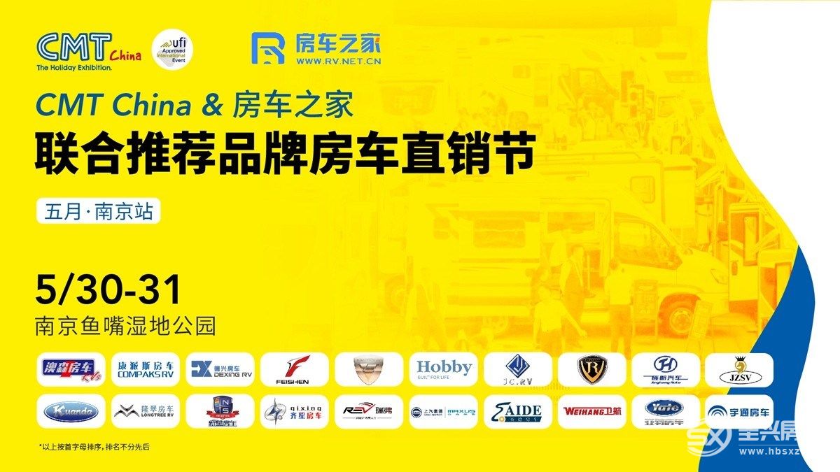 南京國際度假休閑及房車展覽會(CMT China)主辦方南京斯圖加特聯合展覽有限公司與房車行業專業標桿媒體房車之家將聯合于5月30-31日在南京魚嘴濕地公園舉辦CMT China & 房車之家聯合推薦品牌房車直銷節(五月南京站)。