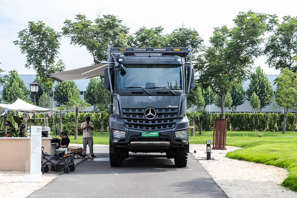 奔馳Arocs 車體采用定制增強廂體+高保溫材質(zhì),外推窗為雙層防爆鋼化材質(zhì),車外配置包括進口電動遮陽棚、外側(cè)LED照明燈帶、便攜式戶外灶具等,支持用戶戶外露營需求。