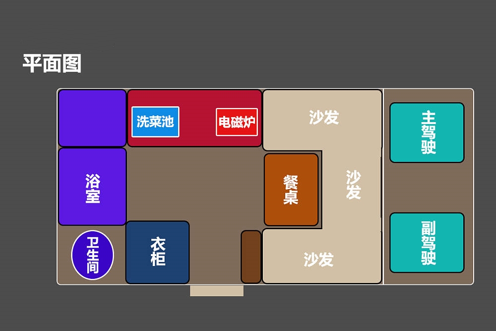 廂體與駕駛室中間設(shè)有通艙窗口,生活區(qū)內(nèi)部行駛中支持載客,前置U型沙發(fā)預留出兩張反向座椅,內(nèi)部可承載2名乘客。