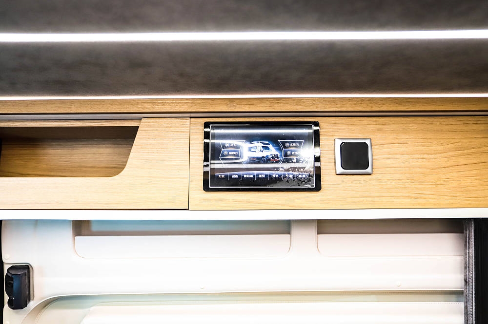 奔馳斯賓特(Sprinter)的車內中控模塊設置在車門上方,需要觸控操作燈光、設備、暖風等重要設備,屏幕也能顯示更多水/電信息。除此之外,新車匹配了車輛智能管控平臺,手機遠程就能控制/查看一些車輛功能。水電方面,搭載160L凈水箱、55L灰水箱,48V 200Ah房車專用鋰電池將為車內提供電能,另外,交流充電、新能源直流快充、400W太陽能充電、48V雙發電可為鋰電進一步補給能源。