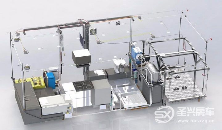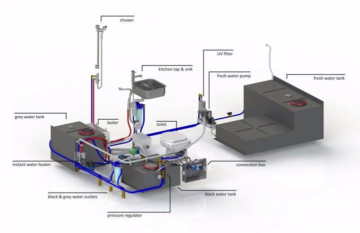 整車配有3個水箱:一個清水箱、一個灰水箱和一個污水箱。清水箱安裝在產品的前面,灰水箱和污水箱都安裝在后面。水箱位置安排是總設計的要求,以確保產品重量達到最佳平衡。為了保證供水質量,水管系統中集成了幾個過濾系統。當過濾清水箱中的水時,水從沉淀濾芯通過。水要經過沉淀、活性碳和紫外線過濾器后,才能使用,以保證所用水百分百的清澈干凈,安全為最重要。