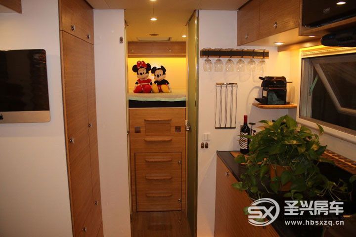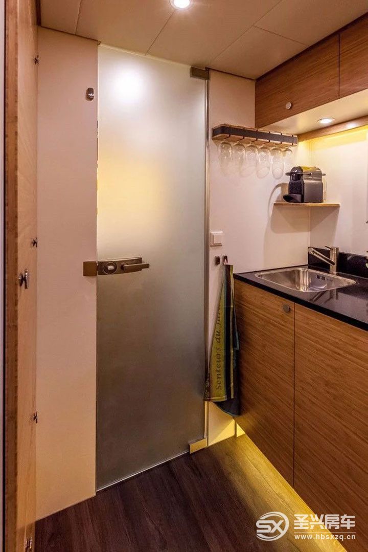 車廂內部不僅提供了所有居家設施,而且還有周密的多功能設計,為您提供一個溫馨而誘人的空間使您的旅途更加愉快。主要配有固定尺寸的舒適雙人床、一6個人的U形沙發(可轉換為一張雙人床)、設備齊全的廚房、一個寬敞的臺面與集成的電磁爐。盥洗室和浴室分開,90度的時候淋浴房門可以分隔間生活和睡眠功能區。位于床下還安置有一臺滾筒洗衣機。