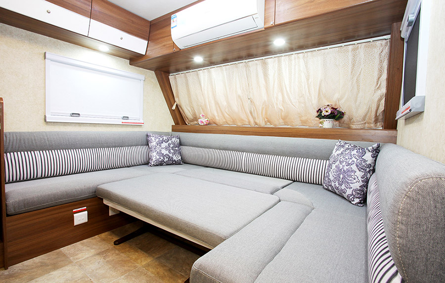 6、功能齊全,進(jìn)口三能源冰箱、拖掛房車專用座便器、熱水器、頂置空調(diào)