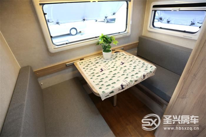 五人版布局箱體前部休息區可作為兩張單人床使用,也可以拼接為2*2米的大床,能睡下三口人。會客區卡座沙發可拼接為2*1.2米雙人床。整體可供五人休息。